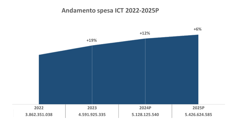 Il 2023 segna un punto di svolta: la spesa ICT delle amministrazioni del panel AgID raggiunge 4,6 miliardi di euro, con un incremento del +19% rispetto al 2022. Il tasso annuo di crescita composto (CAGR) stimato per il periodo 2022-2025 è pari al +12%, sostenuto dall’attuazione del PNRR e dalle politiche di innovazione. Le Amministrazioni centrali (PAC) si confermano il comparto più rilevante, con il 73% della spesa totale, mentre Regioni e Province Autonome e PAL mostrano una crescita significativa, pur con una stabilizzazione prevista nel 2025.